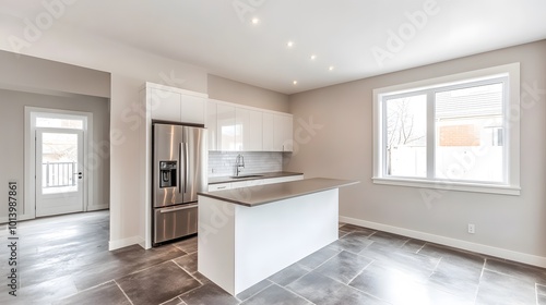 Modern home kitchen interior with a bar counter, fridge, and window, showcasing a clean design