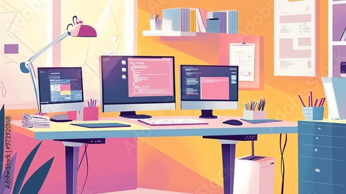 Modern home office workspace with multiple monitors, desk accessories, and vibrant colors, creating a productive environment.