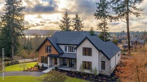 Modern home overlooking lake at sunset