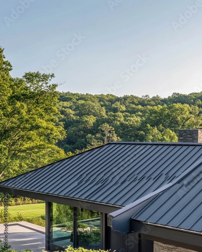 Modern Home with Metal Roof and Forest Backdrop on a Sunny Day in a Rural Setting