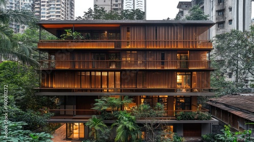 Modern home with wood slat balconies designed for airflow and subtle screening