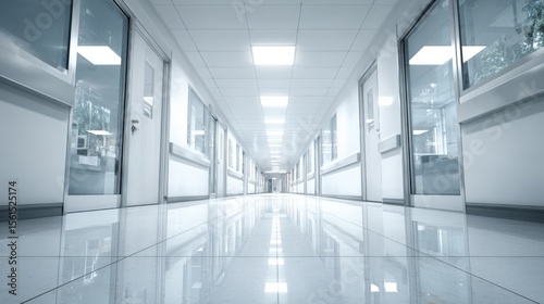 Modern hospital corridor with bright lighting clean white walls and large windows.