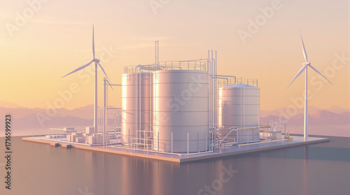Modern hydrogen tanks storage for renewable energy - Hydrogen renewable energy production for solar and windturbine facility. 3d rendering