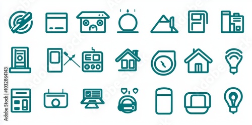 Modern illustration of real estate, smart home and building repair business thin black lines. Outline symbols of automation of house systems as well as furniture and appliances provide access to