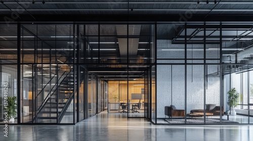 Modern Industrial Office Interior Design: Glass Partitions, Metal Staircase, and Open Workspace
