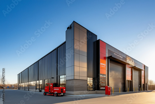 Modern industrial warehouse building with large signage and parked trucks at sunset.