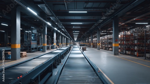 Modern Industrial Warehouse Interior Logistics Conveyor Belt System Efficient Transportation Spacious Facility Cargo