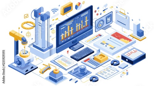Modern Industrial Workspace with Data Analysis and Mechanical Tools