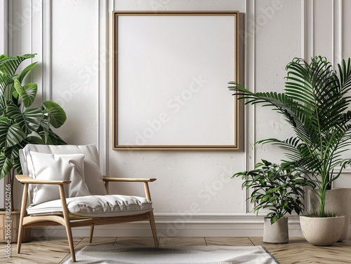 Modern Interior Design Mockup with Empty Frame, Armchair, Plants, White Wall, and Wooden Floor for Art, Poster, or Painting Presentation.