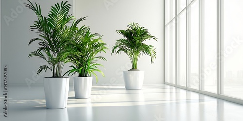 Modern interior design showcasing sunlit potted plants next to a large window