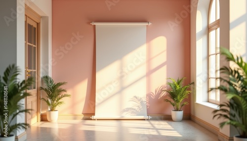 Modern interior with pink walls and natural light from large windows