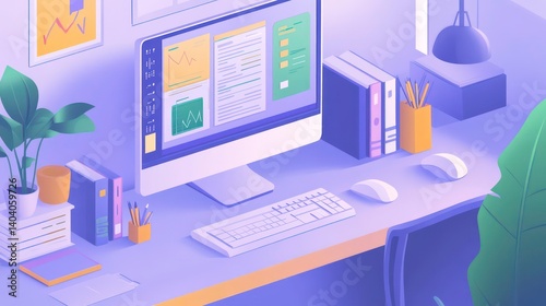 Modern isometric illustration of a workspace with computer, keyboard, mouse, plants, books, and stationery.