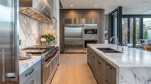 Modern kitchen design featuring stainless steel appliances and elegant marble countertops in a spacious open layout