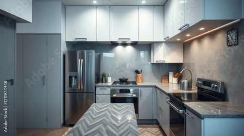 Modern Kitchen Design: Sleek Stainless Steel Appliances and Herringbone Countertops