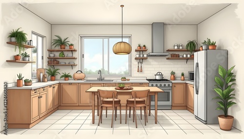 Modern Kitchen Design With Light Wood Cabinets and Plants