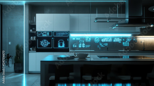 modern kitchen featuring advanced technology with glowing digital interfaces, sleek cabinetry, and minimalist design. ambiance is futuristic and sophisticated, showcasing innovation home design