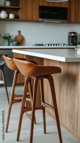 Modern Kitchen Interior Featuring Stylish Wooden Bar Stools with Minimalistic Design and Sleek Countertop, Showcasing Contemporary Home Decor Elements