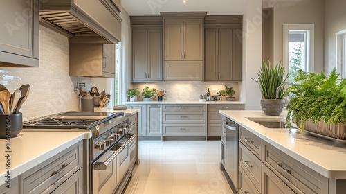 Modern Kitchen Interior with Stainless Steel Appliances and White Countertops