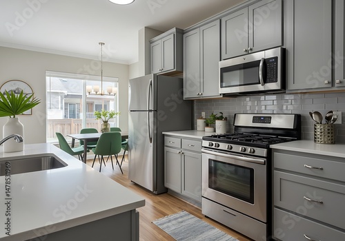 Modern kitchen with gray cabinets, stainless steel appliances and dining area