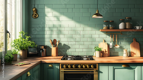 Modern Kitchen with Green Tiles and Wooden Countertops
