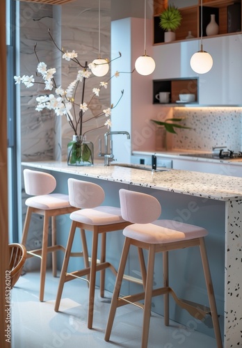 Modern kitchen with pastel pink and blue accents featuring bar stools and floral decor