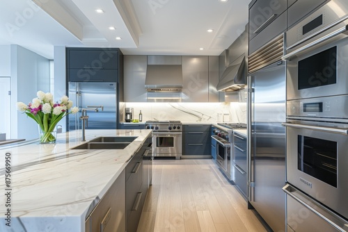 Modern Kitchen with Stainless Steel Appliances and Marble Countertops