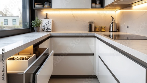 Modern kitchen with white cabinets and sleek countertops. Open drawer reveals organized utensils. Light streams in from a window.