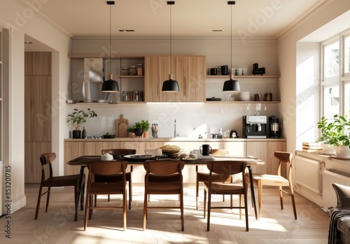 Modern kitchen with white cabinets, wooden walls and a dining table