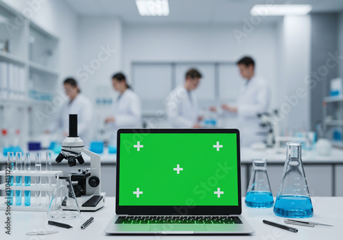 近代的な研究所やラボの環境・ラップトップの画面がグリーンスクリーン(クロマキー処理可能)|Modern laboratory/laboratory environment/Laptop screen is green screen (chroma keying possible)