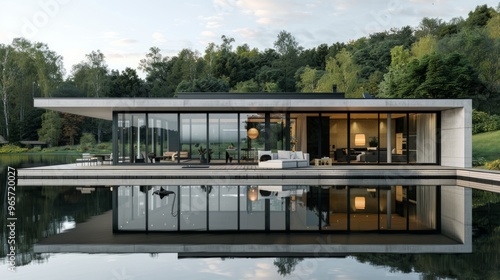 Modern lakefront house with large glass windows reflecting on calm water in a serene natural setting during early evening