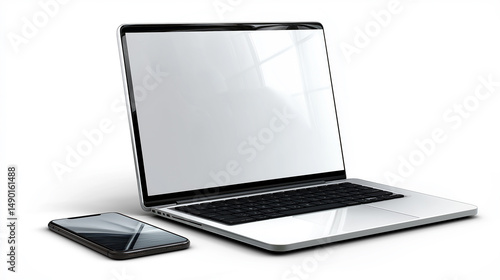 Modern Laptop and Smart phone mockup open white screen with shadow on white table for present web advertising product or Webpage design mockup