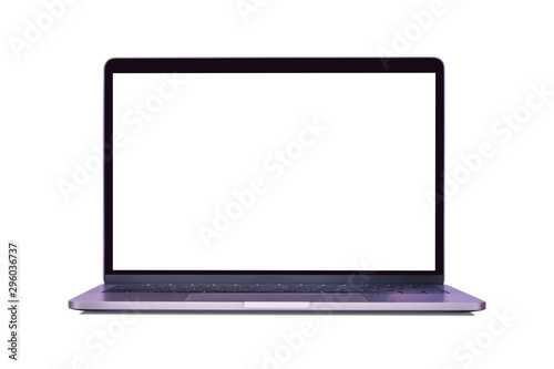 Modern laptop computer in right side view with empty screen mockup template isolated on white background. Blank copy space. Clipping path.All in focus.
