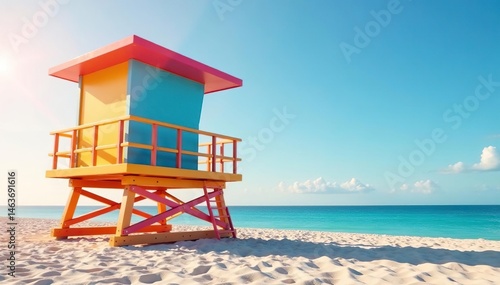 Modern lifeguard tower with vibrant colors against a clear sky, daytime, outdoor scene