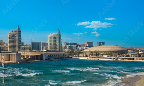 Modern Lisbon panoramic landscape over the Tagus River and the marvelous architecture of the Park of Nations. Cityscape