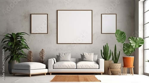 Modern living room interior and frame mockup with plant and couch. 3d rendering. Generative AI