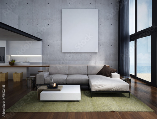 Modern living room interior design and concrete wall background and empty canvas frame and sea view.