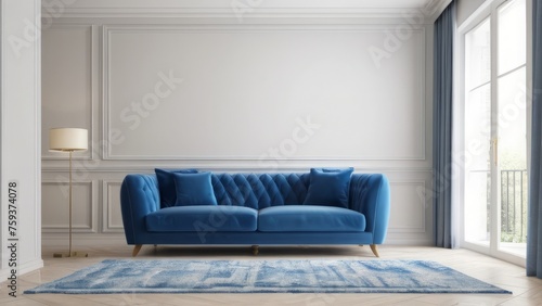 Modern living room interior featuring a stylish blue sofa, rendered in 3D for a realistic and contemporary home design