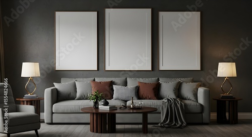 Modern, Living room, Interior, Modern living room interior with gray sofa and three blank frames