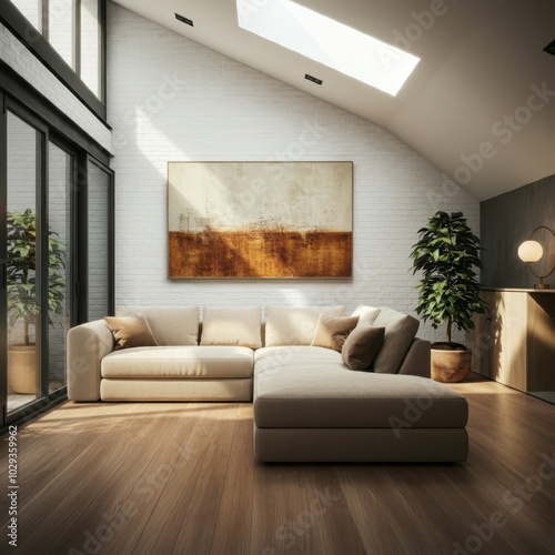 modern living room, minimalist interior design, large abstract painting, floor-to-ceiling windows, natural light, wooden floors, beige L-shaped sofa, potted plants, white brick walls, coffee table, ta