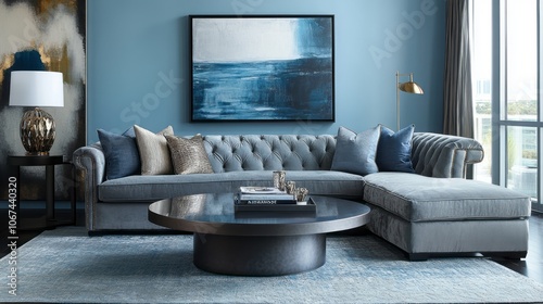 Modern Living Room with Blue Sectional Sofa and Abstract Artwork