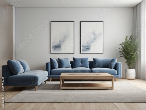 Modern Living Room with Blue Sofa, Wooden Coffee Table, and Abstract Artwork