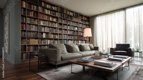 Modern living room with book wall and invisible shelf