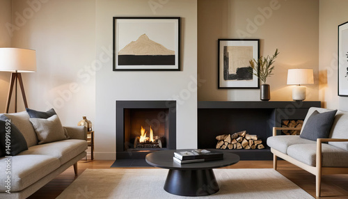 Modern living room with cozy fireplace, stylish furniture, and elegant decor