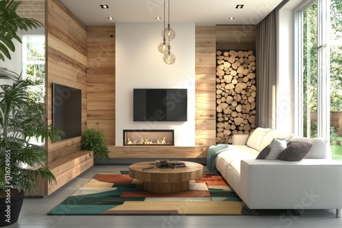 Modern living room with fireplace, wood wall, and large windows. (2)
