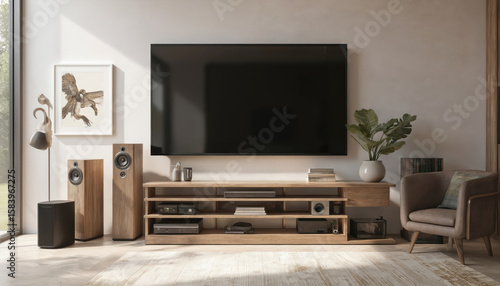 Modern living room with flat screen TV mounted on marble wall. Wooden speaker system, black stand, bookcase with decor. Comfortable brown armchair, plush pillow, white walls, wooden floor. Warm