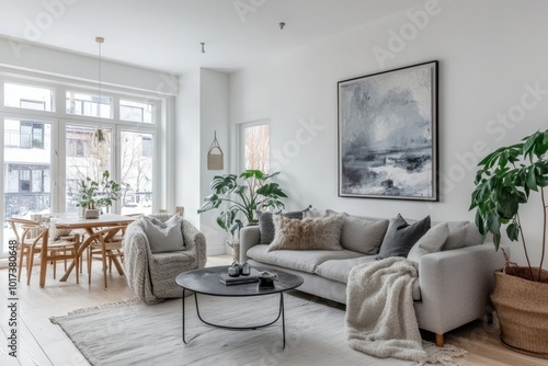 Modern living room with gray sofa, abstract painting, and potted plants.