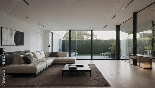 Modern living room with large beige sectional sofa, dark brown rug, and floor-to-ceiling glass doors opening to a garden. Minimalist décor with artwork and low coffee table. Light wood floors.
