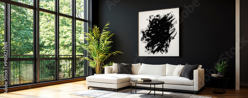 Modern living room with large windows, minimalist decor, and stylish artwork, perfect for creating a serene atmosphere.