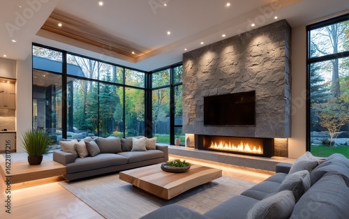 Modern living room with stone fireplace