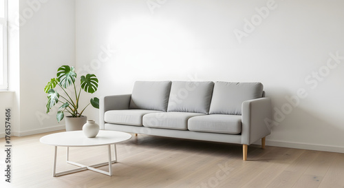 Modern living room with stylish grey sofa and plant for comfortable home vibes